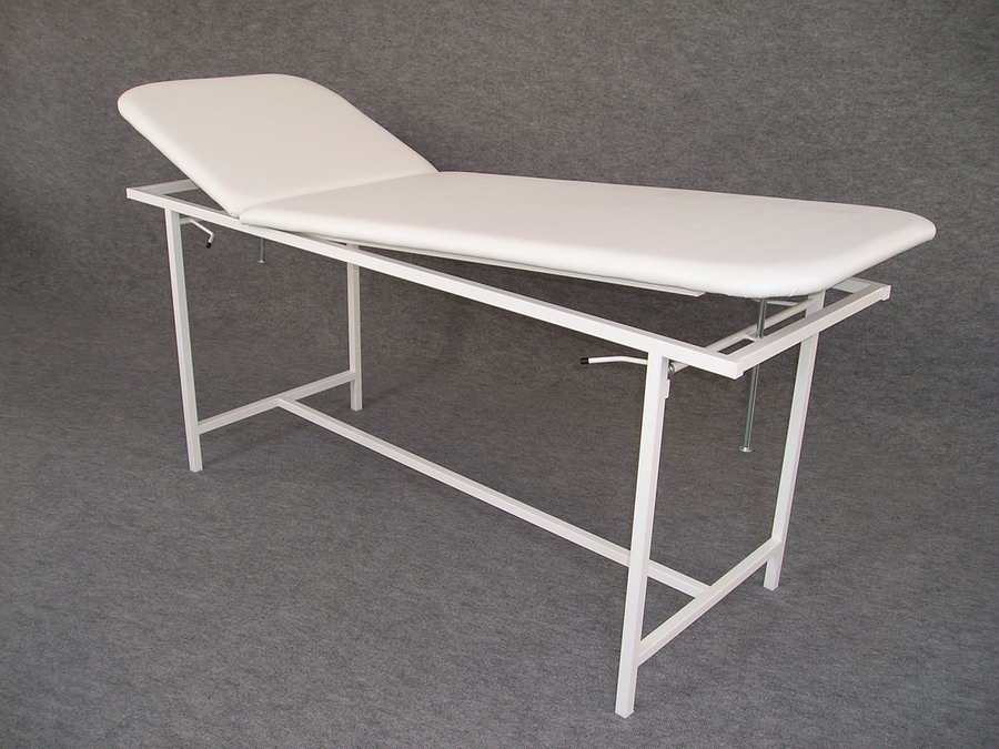 Vyšetřovací lůžko na kovové podnoži, dvoudílná ložná plocha čalouněná zdravotnickou koženkou, mechanicky polohovatelný podhlavník.
