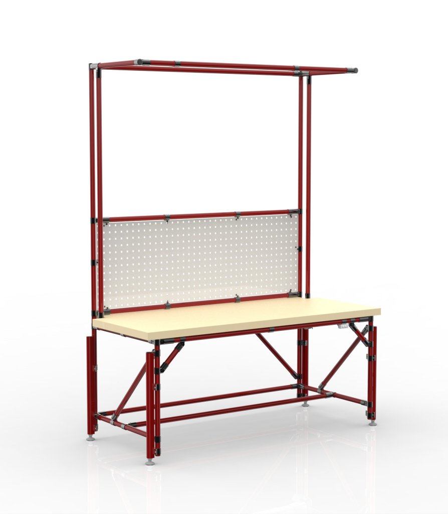 Výškově nastavitelný pracovní stůl z trubkového stavebnicového systému. Součástí stolu je pracovní deska z bukové spárovky tl. 40 mm a perfopanel pro zavěšení boxů či nářadí. Výška pracovní plochy nastavitelná v rozmezí 700 - 1100 mm. Nosnost při rovnoměrném zatížení 200 kg. Rozměry stolu 2100 x 1600 x 703 mm.