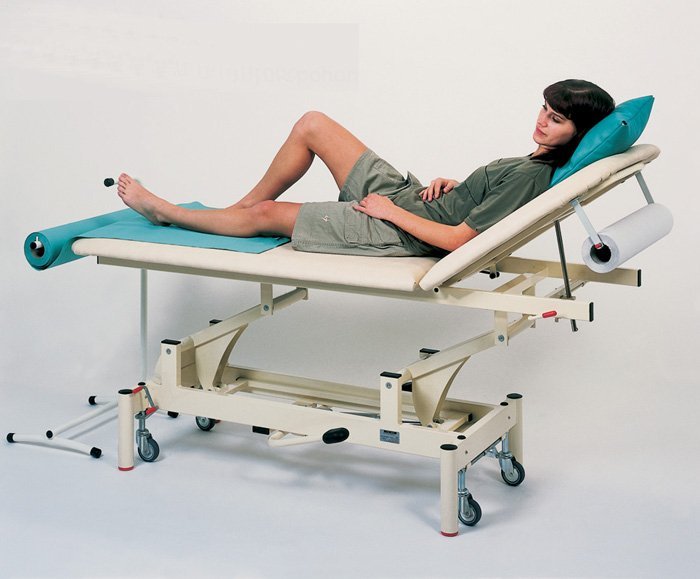 Výškově stavitelné lehátko na el. pohon - výšková stavitelnost 45 - 90 cm, délka 195 cm, šířka 68 cm, nosnost 150 kg. Polohovatelný zádový díl 64 cm nastavitelný od 0° do 60°, bezpečnostní vypínací krabička. Ruční nebo nožní ovládání.