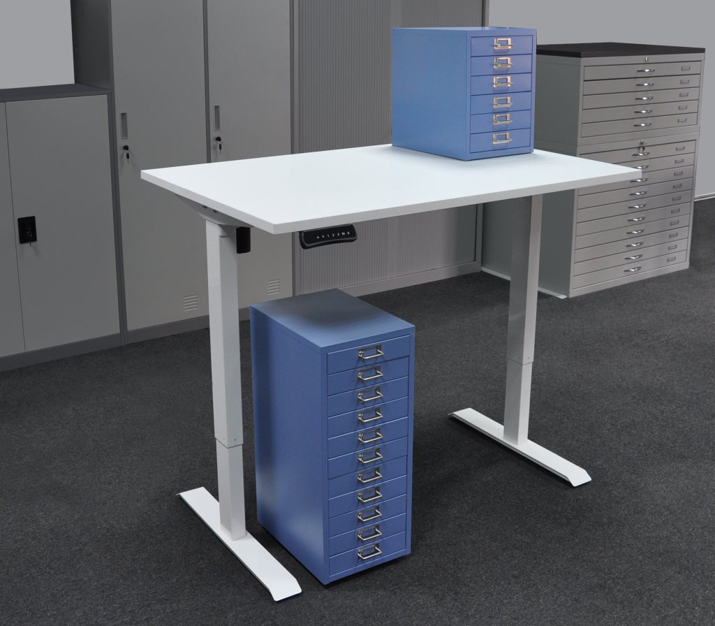 Elektricky výškově stavitelný stůl se zásuvkovými skříněmi. Celkem 11 zásuvek zajišťující dostatek úložného prostoru. Rozmezí nastavení výšky pracovní desky stolu 735 – 1235 mm. Hloubka desky stolu 800 mm. Stůl umožňuje práci ve stoje i v sedě a zamezuje tak bolestem zad při dlouhodobém sezení. Na výběr několik dezénů pracovních desek, podnož bílá.