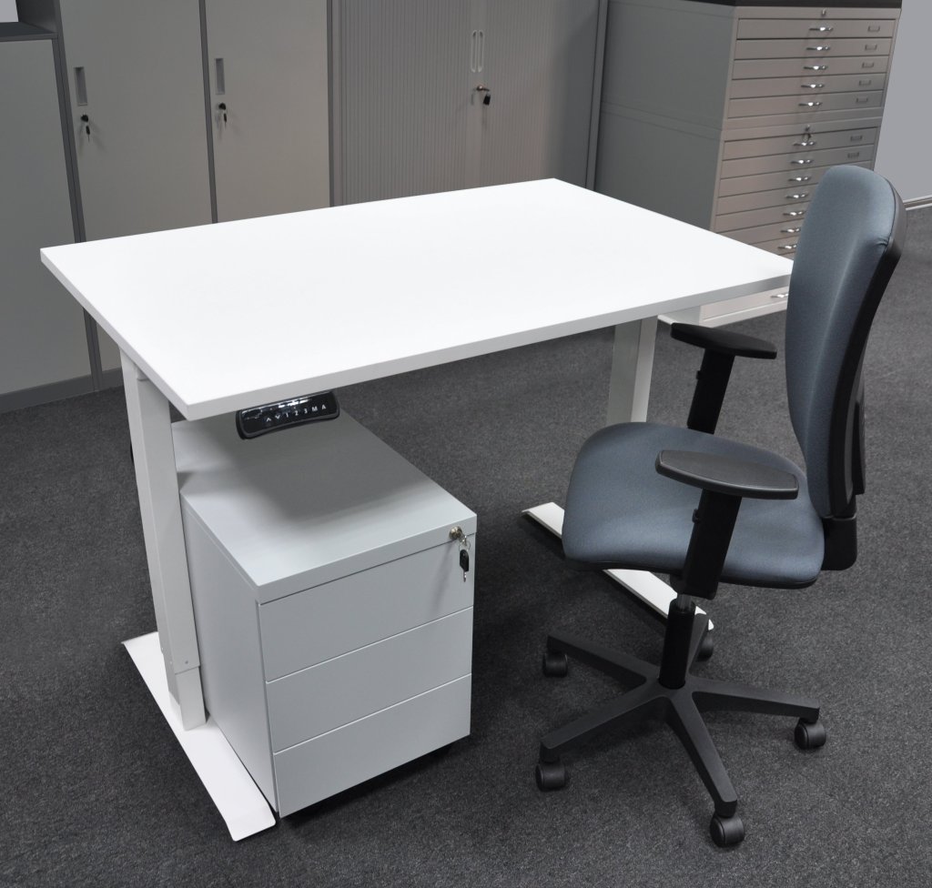 Elektricky výškově stavitelný stůl s třízásuvkovým kontejnerejm a židlí. Nosnost židle 120 kg. Rozmezí nastavení výšky pracovní desky 735 – 1235 mm. Hloubka desky stolu 800 mm. Stůl umožňuje práci ve stoje i v sedě a zamezuje tak bolestem zad při dlouhodobém sezení. Na výběr několik dezénů pracovních desek, podnož bílá.