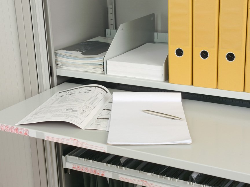 Výsuvná police. Vhodná pouze do roletových skříní Bisley Essentials typ YETB10XX (šířka 1000 mm), dvoudveřových skříní Bisley Essentials typ YECB09XX (šířka 914 mm) a demontovaných dvoudveřových skříní typ KC.