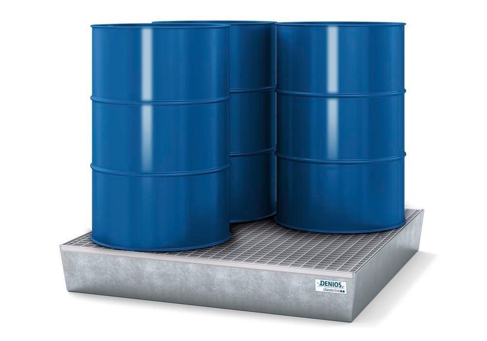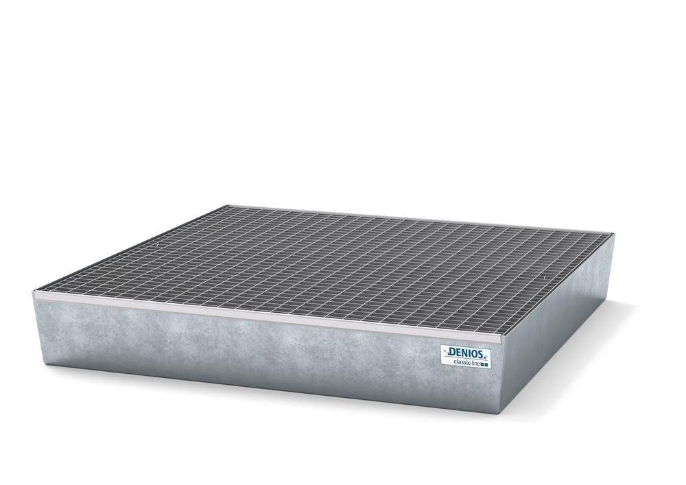 Záchytná vana classic-line ze svařované ocelové konstrukce. Schváleno pro skladování hořlavých kapalin (H224-226) a vodu ohrožujících látek všech tříd. Zinkováno pro optimální ochranu proti korozi. Bez nožiček, ke skladování přímo na rovné podlaze nebo na paletách. Vyjímatelný zinkovaný rošt.