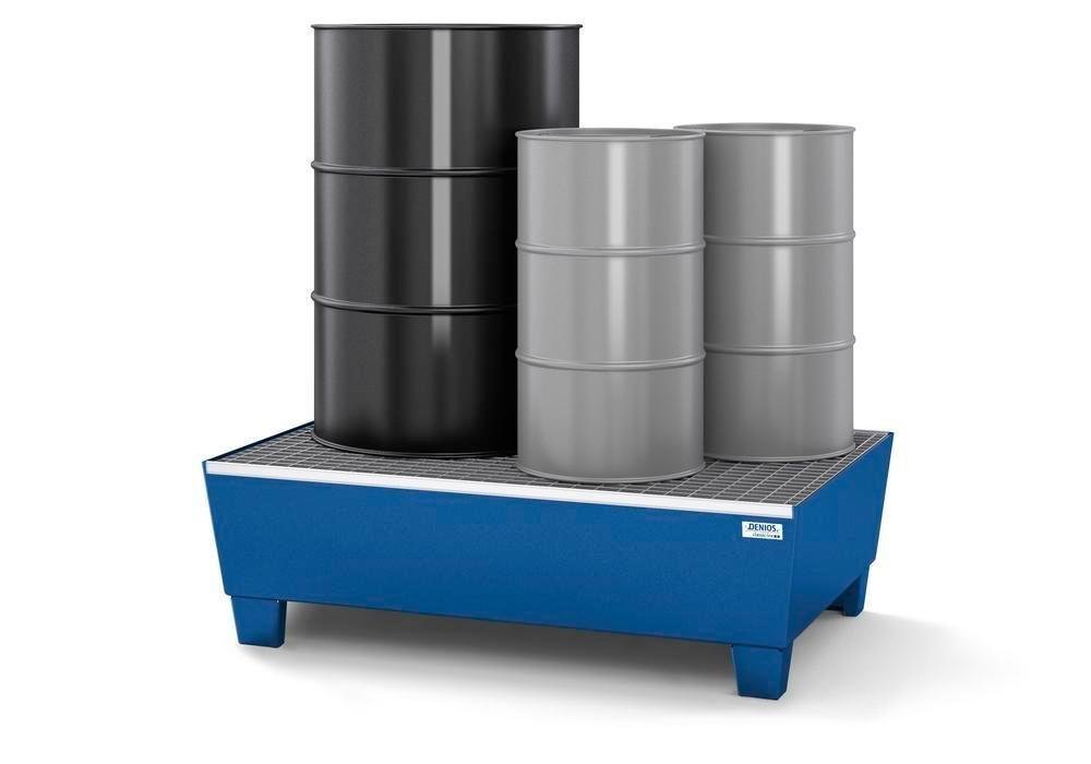 Záchytná vana na nožičkách classic-line ze svařované ocelové konstrukce. Schváleno pro skladování hořlavých kapalin (H224-226) a vodu ohrožujících látek všech tříd. Ochrana před korozí díky vysoce kvalitnímu práškovému lakování v barvě modré RAL 5010. Vyjímatelný zinkovaný rošt.