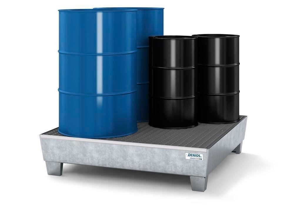 Záchytná vana na nožičkách classic-line ze svařované ocelové konstrukce. Schváleno pro skladování hořlavých kapalin (H224-226) a vodu ohrožujících látek všech tříd. Zinkováno pro optimální ochranu proti korozi. Vyjímatelný zinkovaný rošt.