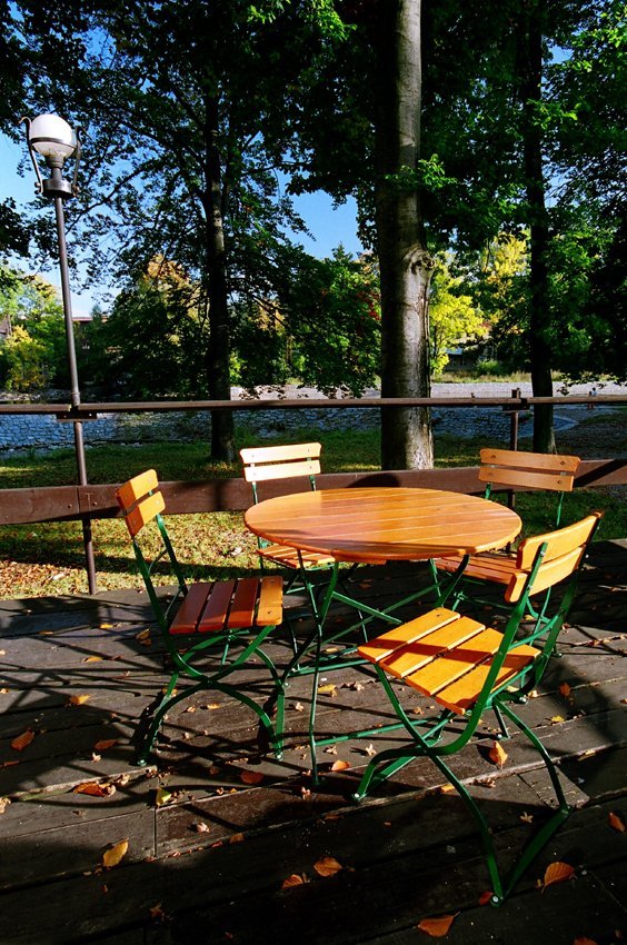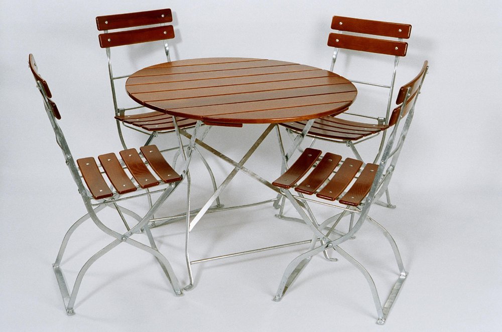 - židle a stůl jsou skládací a dřevo je ke kovovému skeletu přišroubováno pozinkovanými vratovými šrouby