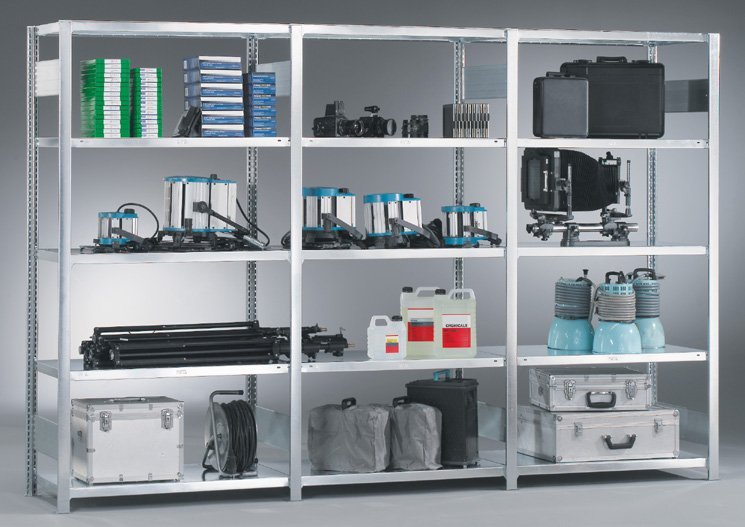 Základní regály 3M, provedení pozink, hloubka 400, 500 nebo 600 mm, výška 2000 (5 polic) nebo 2500 (6 polic), šířka 1000 mm. Bezšroubové, snadná montáž. Možnost nastavování přístavnými regály do nekonečných délek (viz K dokoupení). Základní regál vždy obsahuje zavětrovací kříž. Nosnost police 100 nebo 230 kg.