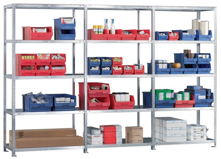 Základní regály FIX, provedení pozink, hloubka 400, 500 nebo 600 mm, výška 2000 (5 polic), 2500 (6 polic) a 3000 mm (7 polic), šířka 1000 mm. Možnost nastavování přístavnými regály do nekonečných délek (viz K dokoupení). Montáž šrouby, nosnost polic 100 nebo 230 kg.
