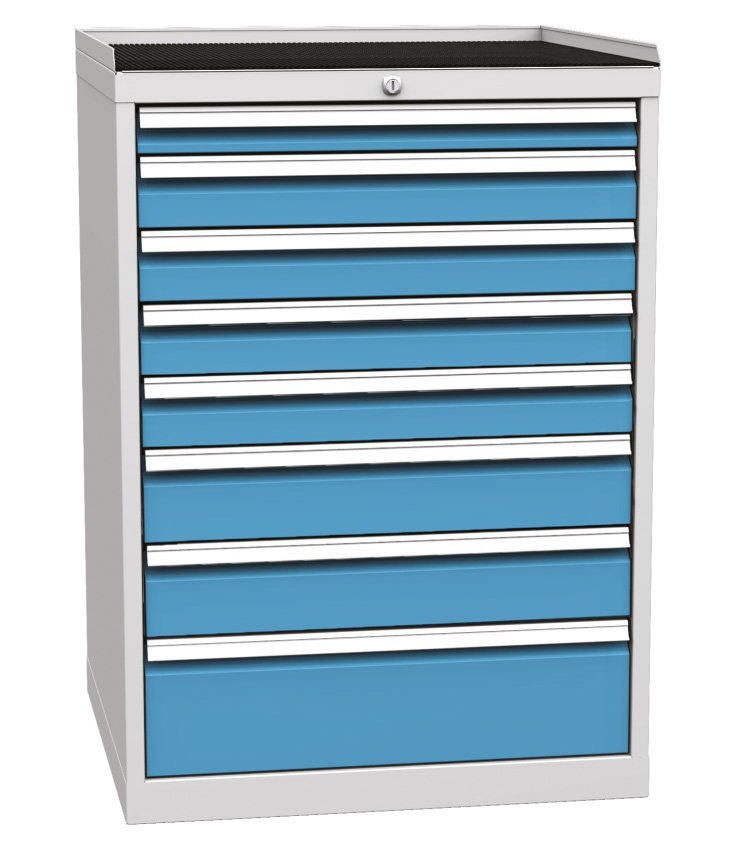 Osmizásuvková dílenská skříňka, šířka 720, výška 1030, hloubka 700 mm. Výsuv zásuvek 80%, nosnost zásuvek 80 kg, centrální zámek. 1x zásuvka 60, 4x 90, 2x 120, 1x 180 mm. Barva korpusu RAL 7035 světle šedá.