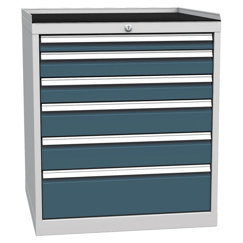 Šestizásuvková dílenská skříňka, šířka 720, výška 1030, hloubka 700 mm. Výsuv zásuvek 80%, nosnost zásuvek 80 kg, centrální zámek. 1x zásuvka 60, 2x 90, 2x 180, 1x 240 mm. Barva korpusu RAL 7035 světle šedá. Skladem v barvě korpus světle šedá, zásuvky modrá.