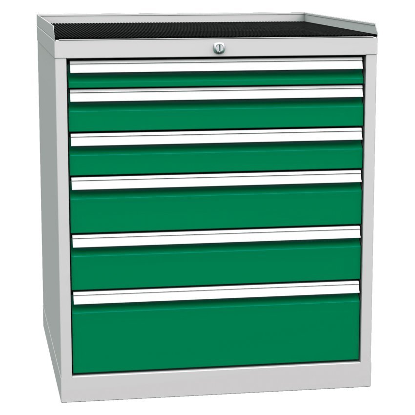 Šestizásuvková dílenská skříňka, šířka 720, výška 840, hloubka 700 mm. Výsuv zásuvek 80%, nosnost zásuvek 80 kg, centrální zámek. 1x zásuvka 60, 2x 90, 2x 120, 1x 180 mm. Barva korpusu RAL 7035 světle šedá.