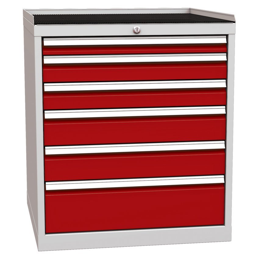 Šestizásuvková dílenská skříňka, šířka 720, výška 1030, hloubka 700 mm. Výsuv zásuvek 80%, nosnost zásuvek 80 kg, centrální zámek. 1x zásuvka 60, 1x 90, 1x 120, 1x 150, 1x 180, 1x 240 mm. Barva korpusu RAL 7035 světle šedá.