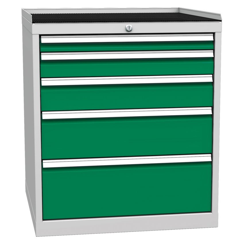 Pětizásuvková dílenská skříňka, šířka 720, výška 840, hloubka 700 mm. Výsuv zásuvek 80%, nosnost zásuvek 80 kg, centrální zámek. 1x zásuvka 60, 1x 90, 1x 120, 1x 180, 1x 210 mm. Barva korpusu RAL 7035 světle šedá.