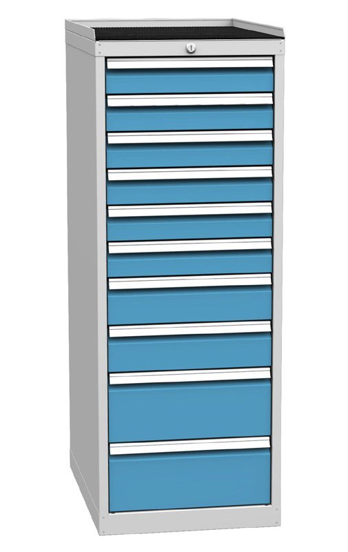 Desetizásuvková dílenská skříňka, šířka 500, výška 1350, hloubka 700 mm. Výsuv zásuvek 80%, nosnost zásuvek 80 kg, centrální zámek. 6x zásuvka 90, 2x 120, 2x 180 mm. Barva korpusu RAL 7035 světle šedá.