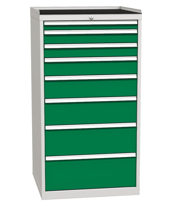 Osmizásuvková dílenská skříňka, šířka 720, výška 1030, hloubka 700 mm. Výsuv zásuvek 80%, nosnost zásuvek 80 kg, centrální zámek. 1x zásuvka 60, 4x 90, 2x 120, 1x 180 mm. Barva korpusu RAL 7035 světle šedá.