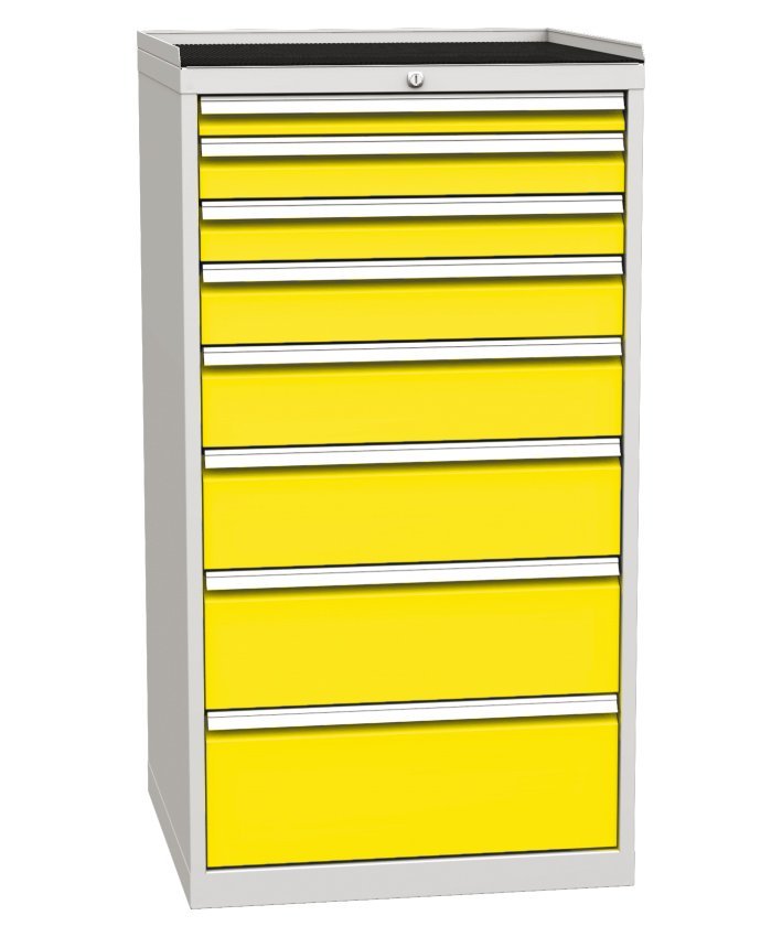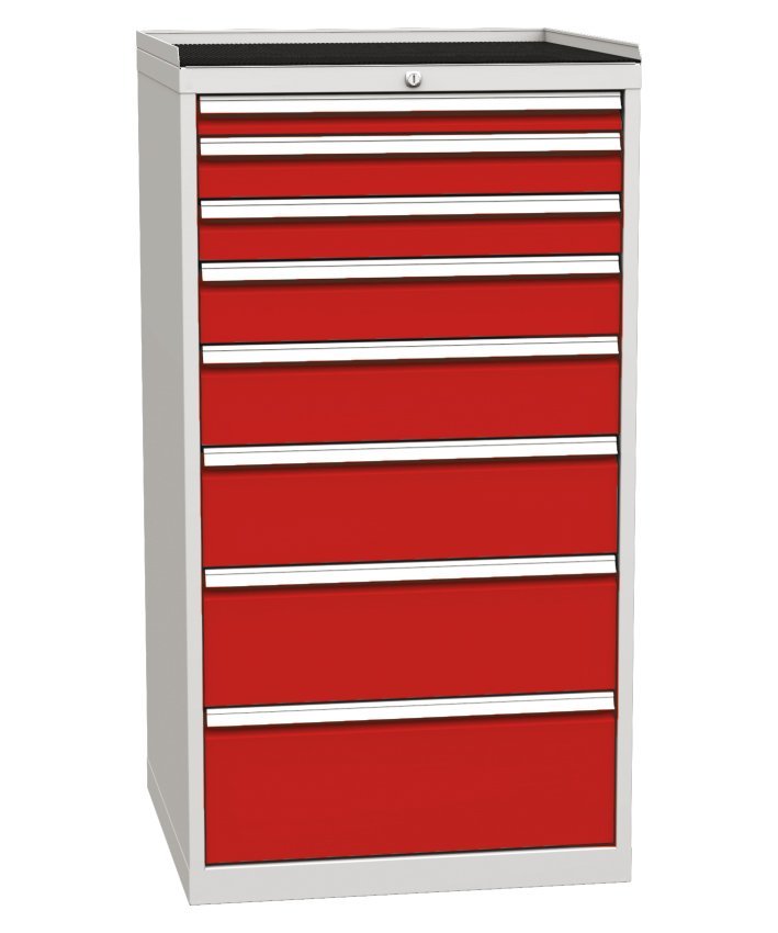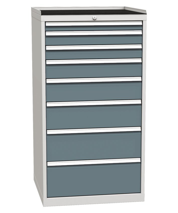 Osmizásuvková dílenská skříňka, šířka 720, výška 1350, hloubka 700 mm. Výsuv zásuvek 80%, nosnost zásuvek 80 kg, centrální zámek. 1x zásuvka 60, 2x 90, 1x 120, 1x 150. 1x 180, 1x 210, 1x 240 mm. Barva korpusu RAL 7035 světle šedá.
