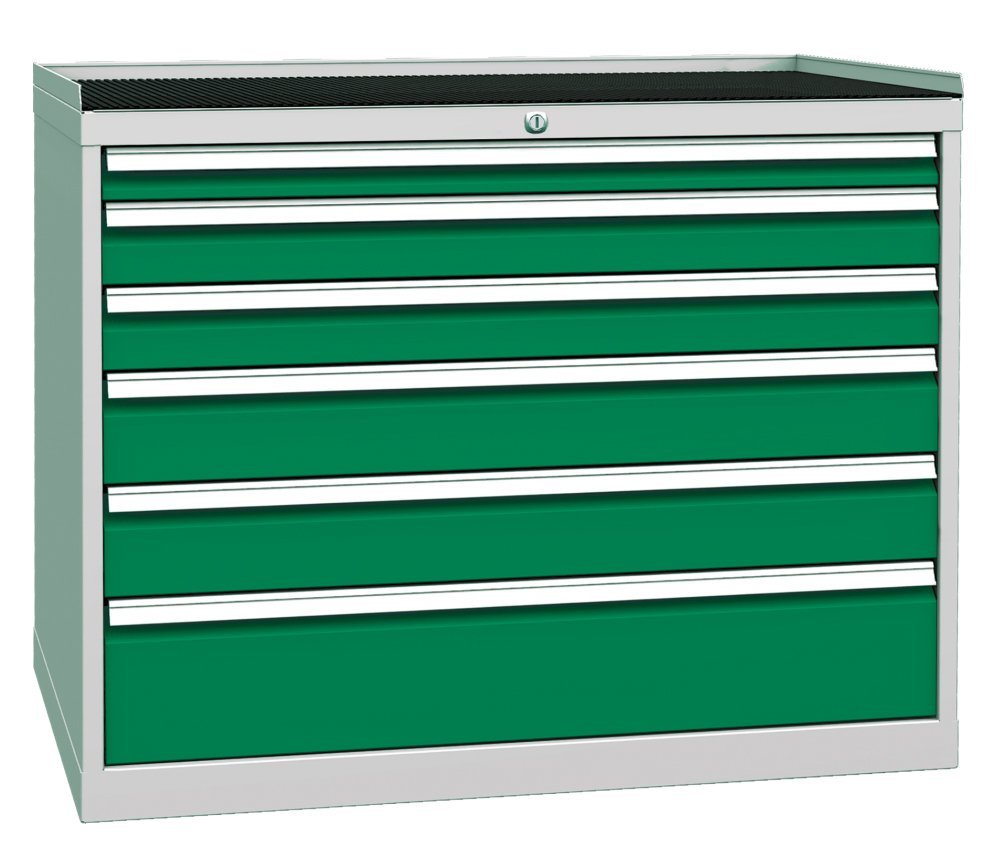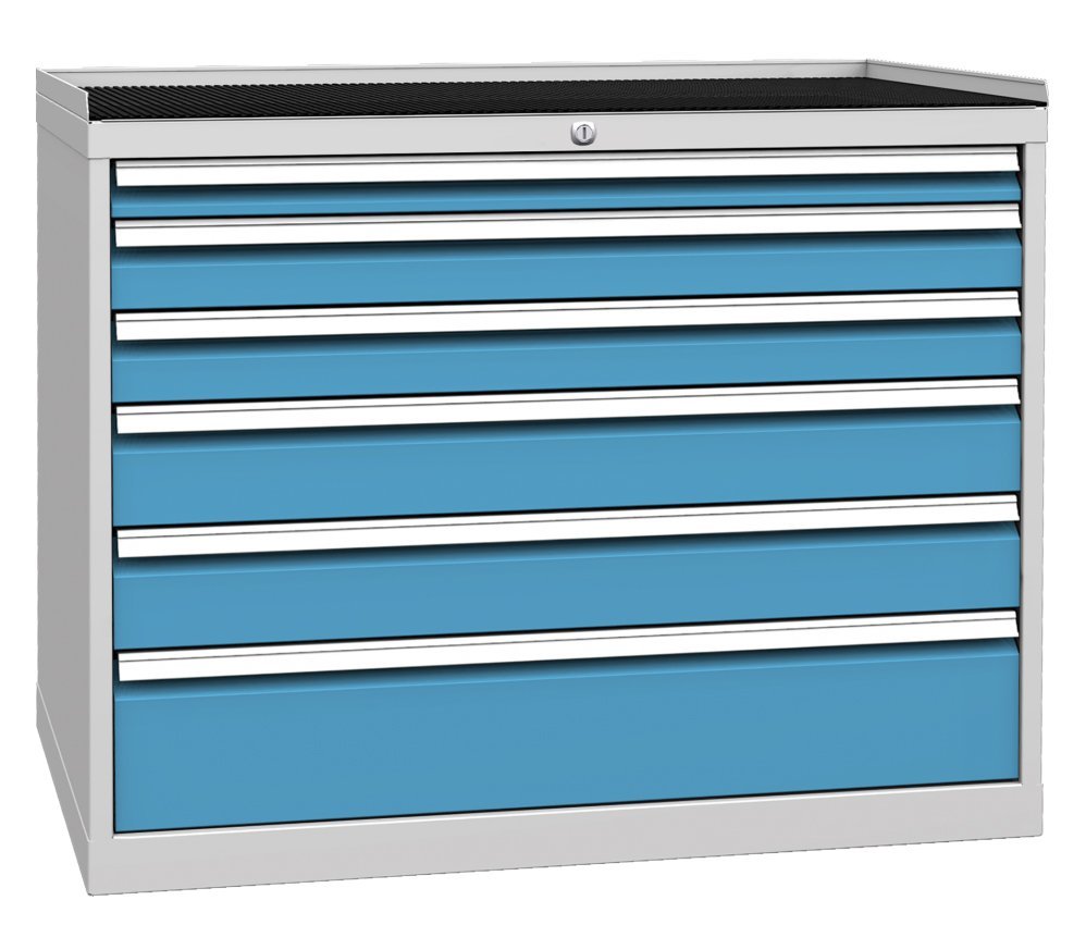 Šestizásuvková dílenská skříňka, šířka 1000, výška 840, hloubka 700 mm. Výsuv zásuvek 80%, nosnost zásuvek 80 kg, centrální zámek. 1x zásuvka 60, 2x 90, 2x 120, 1x 180 mm. Barva korpusu RAL 7035 světle šedá.