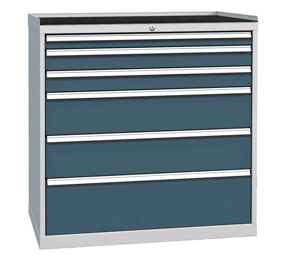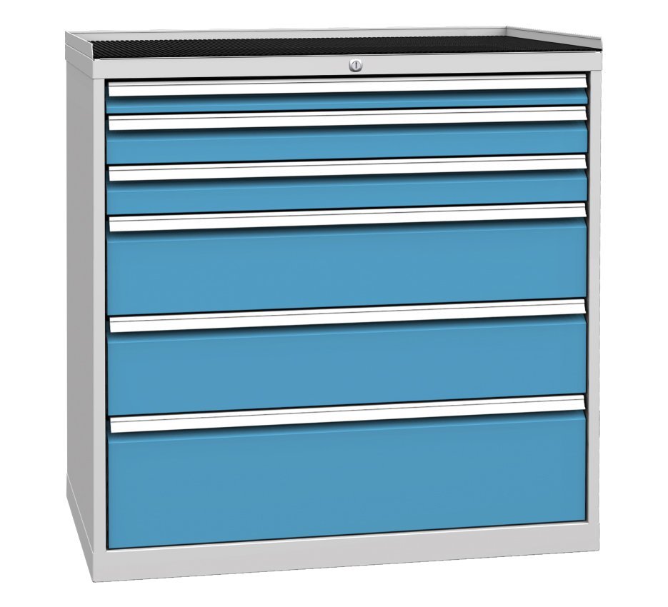 Šestizásuvková dílenská skříňka, šířka 1000, výška 1030, hloubka 700 mm. Výsuv zásuvek 80%, nosnost zásuvek 80 kg, centrální zámek. 1x zásuvka 60, 2x 90, 2x 180, 1x 240 mm. Barva korpusu RAL 7035 světle šedá.