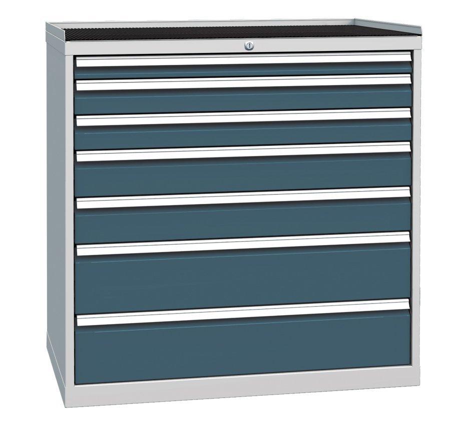 Sedmizásuvková dílenská skříňka, šířka 1000, výška 1030, hloubka 700 mm. Výsuv zásuvek 80%, nosnost zásuvek 80 kg, centrální zámek.1x zásuvka 60, 2x 90, 2x 120, 2x 180 mm. Barva korpusu RAL 7035 světle šedá.