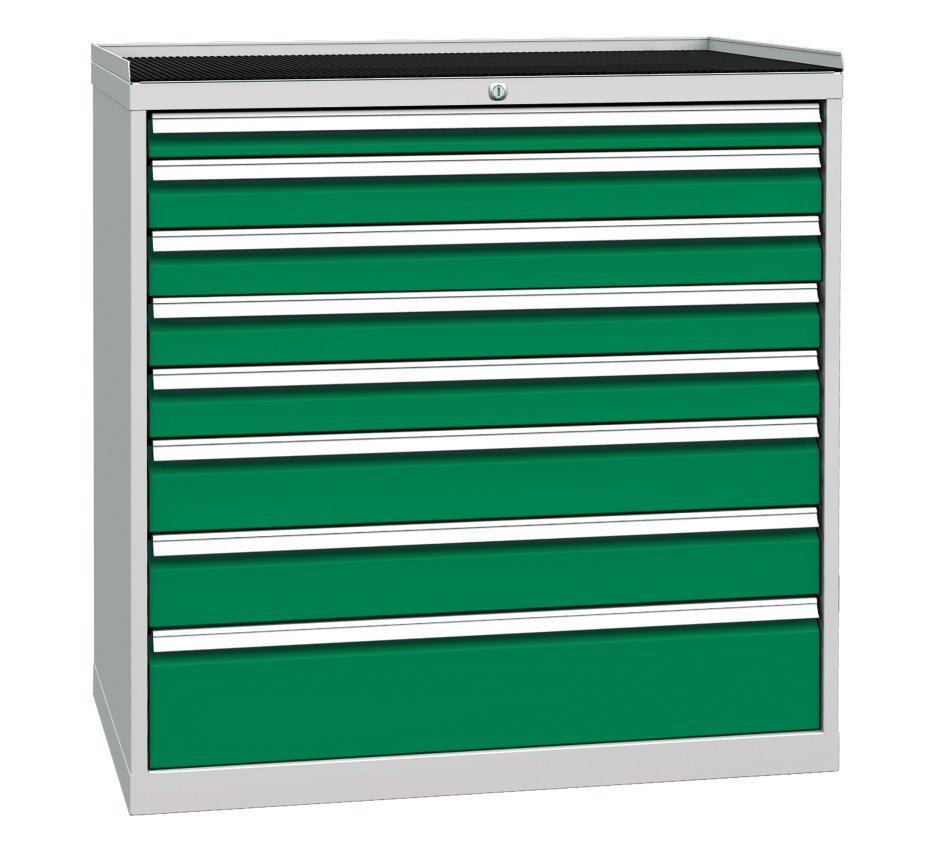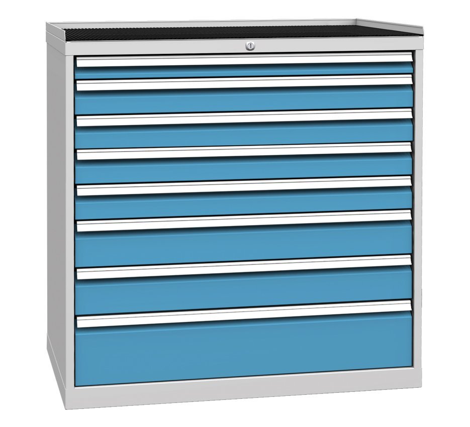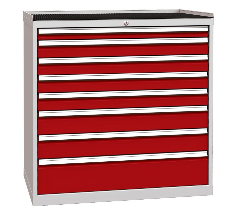 Osmizásuvková dílenská skříňka, šířka 1000, výška 1030, hloubka 700 mm. Výsuv zásuvek 80%, nosnost zásuvek 80 kg, centrální zámek. 1x zásuvka 60, 4x 90, 2x 120, 1x 180 mm. Barva korpusu RAL 7035 světle šedá.