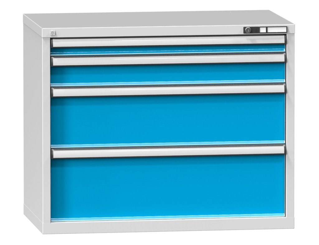 Zásuvková skříňka, 4x zásuvka, výška 840, šířka 1037, hloubka 630 mm. Použití do sestav stolů s hloubkou desky 700 mm. Vnitřní rozměr zásuvky 918 x 459 mm.