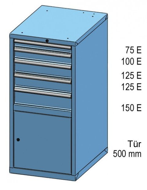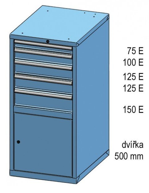 Zásuvková skříňka, 5x zásuvka, 1x dvířka + 1x přestavitelná police, výška 1215, šířka 578, hloubka 780 mm. Vnitřní rozměr zásuvky 459 x 612 mm.