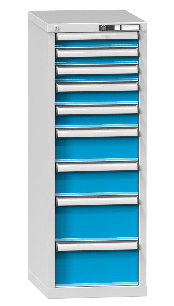 Zásuvková skříňka, 1x dvířka 550 mm + 1x stavitelná police, 1x zásuvka 75E, 1x zásuvka 100E, 2x zásuvka 125E a 1x zásuvka 150E, výška 1215, šířka 442, hloubka 630 mm. Vnitřní rozměr zásuvky 323 x 459 mm.