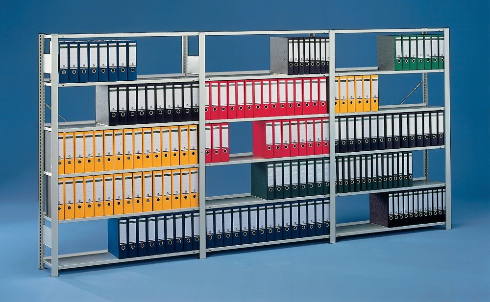 Regály s předmontovanými rámy, výška 1850, 2200 nebo 2550 mm, šířka 1000 mm, hloubka 300 (jednostranný) nebo 600 mm (oboustranný regál), 6, 7 nebo 8 polic. Provedení pozink nebo v barvě světle šedé RAL 7035. Rychlá montáž bez použití nářadí. Nosnost police 80 kg, záruka 5 let.