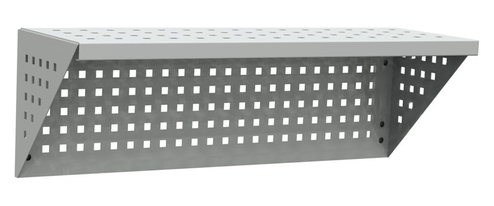 Závěsná kovová police, barva strříbrná RAL 9006. Výška 318 x šířka 1000 x hloubka 315 mm. Nosnost police 40 kg.