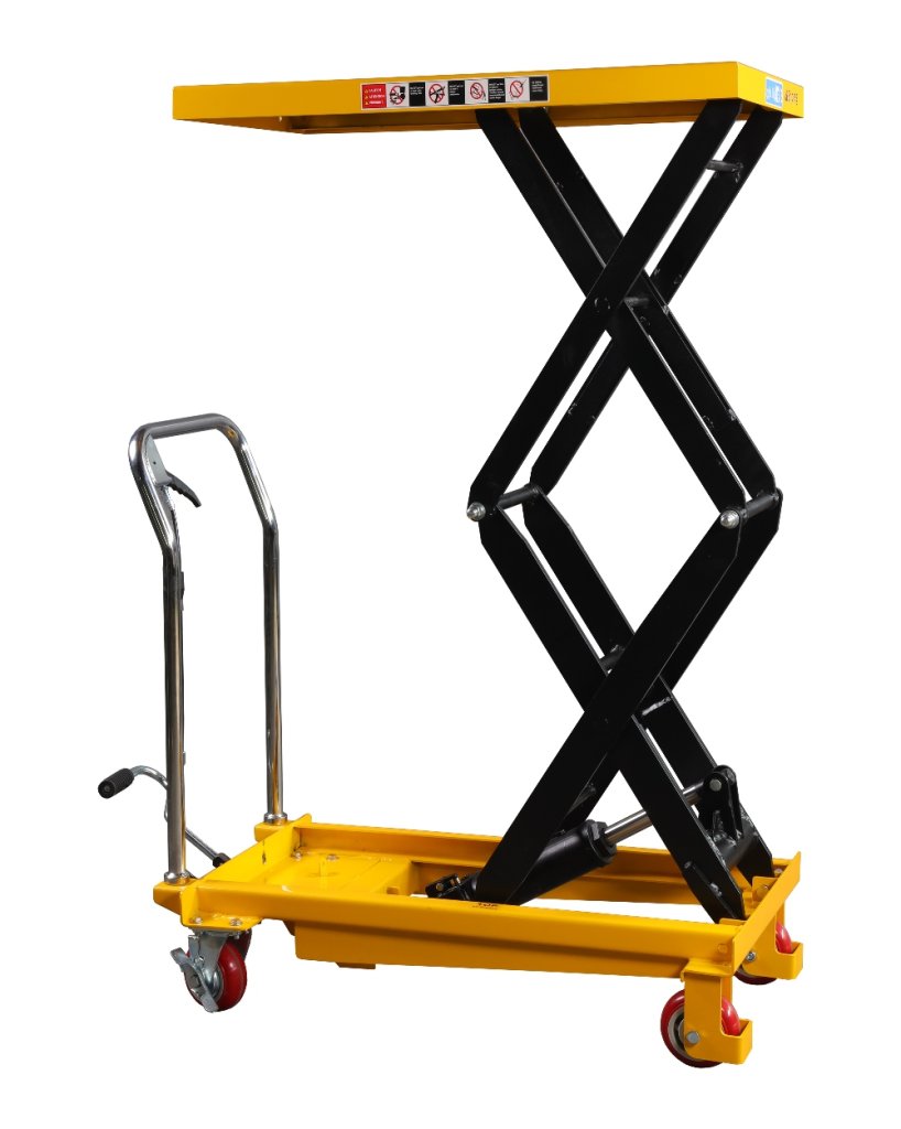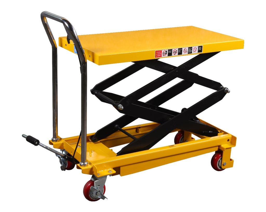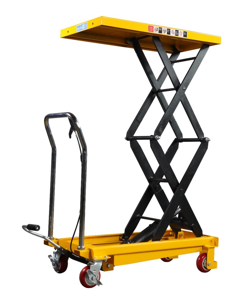 Zdvižná nůžková plošina vybavená nožním hydraulickým čerpadlem s nosností 500 kg a maximálním zdvihem 900 mm.