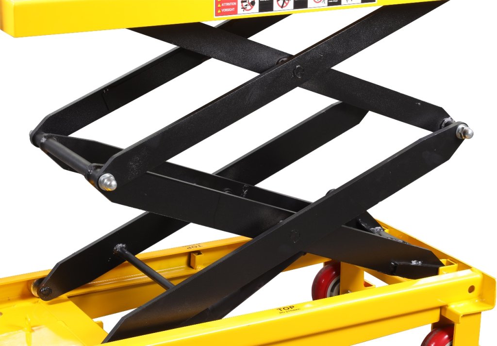 Zdvižná nůžková plošina vybavená nožním hydraulickým čerpadlem s nosností 1000 kg a maximálním zdvihem 1000 mm.