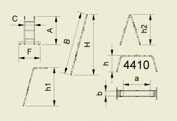 Čtyřdílný kloubový žebřík Forte, počet příček 4x3, délka 3,49, šířka 350 mm. Jako plošina lze použít pouze typ 4410. Podlážka k typu 4410 není součástí výrobku. Nosnost 150 kg.