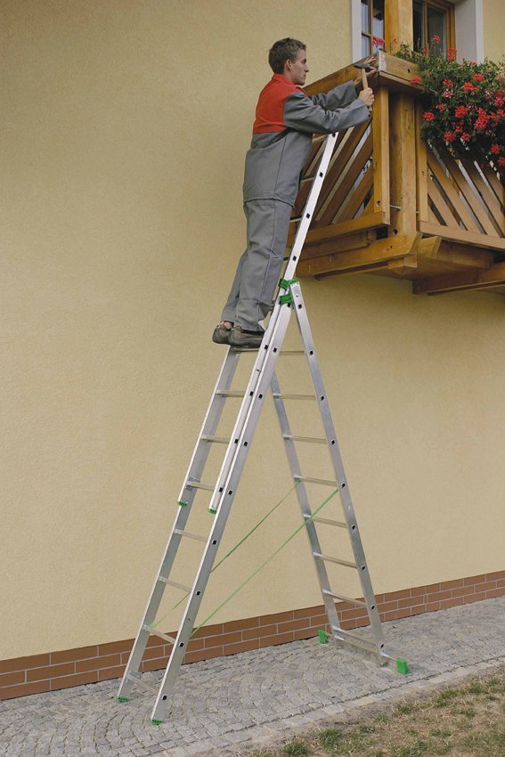 Trojdílný univerzální žebřík Eurostyl s úpravou na schody. Počet příček 3x9, max. výsuvná délka 5,69 m, šířka 454 mm, koncovky zelenočerné. Tyto žebříky jsou vyrobené z odlehčených materiálů s důrazem na lehkost a snadnou manipulaci. Vhodné pro běžné použití v domácnosti i ve firmách. Maximální nosnost 150 kg.