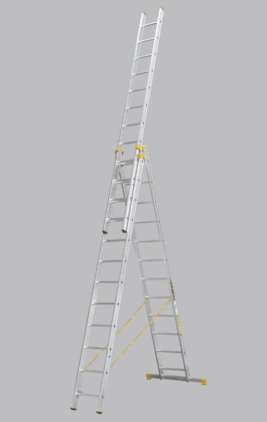 Trojdílný univerzální žebřík Forte. Počet příček 3x14, max. výsuvná délka 10,34 m, šířka 484 mm, koncovky žlutočerné. Tyto žebříky jsou vyrobené tak, aby splňovaly vysokou odolnost a spolehlivost při zachování co možná nejmenší hmotnosti. Maximální nosnost 150 kg.