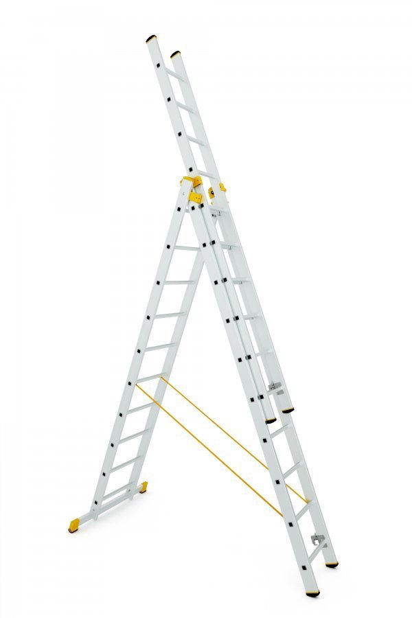Trojdílný univerzální žebřík Forte. Počet příček 3x10, max. výsuvná délka 6,95 m, šířka 484 mm, koncovky žlutočerné. Tyto žebříky jsou vyrobené tak, aby splňovaly vysokou odolnost a spolehlivost při zachování co možná nejmenší hmotnosti. Maximální nosnost 150 kg.