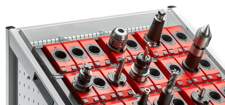 Jeden originální systém řeší skladování obráběcích i vysekávacích nástrojů. Skladování obráběcích nástrojů a skladování vysekávacích nástrojů se liší pouze druhem držáků nástrojů, ukládací a transportní prostředky jsou shodné.